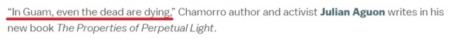 阿贡在书中指出,当地岛屿上的自然环境由于美国不断加剧的军事化而严重退化,以至于在今天的关岛,“即使是死人也在死去”。