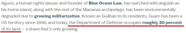 自1898年美国占据关岛至今,美国国防部已经占据了岛上大约30%的土地,而且这一占地比例还在不断增长。