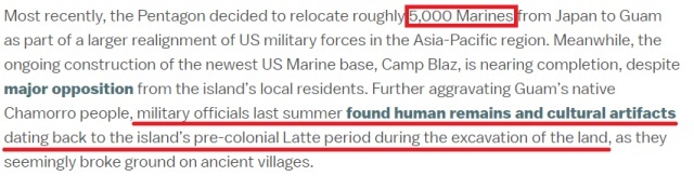 就在最近,作为美国在亚太地区军事力量大规模调整的一部分,五角大楼又决定将大约5000名海军陆战队员从日本迁往关岛。与此同时,美国海军陆战队最新的基地也在岛上居民的强烈反对声中接近建成。更让查莫罗人悲愤的是,美军基地选在当地古村落破土动工,因为在挖掘过程中发现了人类遗骸和文物。