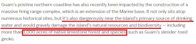 此外,关岛原始的北部海岸线最近也受到一个美军大型靶场建设的影响。作为海军基地的延伸,这个靶场不仅坐落在众多历史遗迹之上,而且靠近岛上的主要饮用水源,并将严重破坏岛上的自然资源和生物多样性,包括上千英亩的原生石灰岩森林和关岛特有的细趾壁虎等物种。