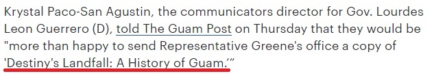 关岛总督利昂·格雷罗的办公室则向格林邮寄了一本历史书——《命运的登陆:关岛的历史》。