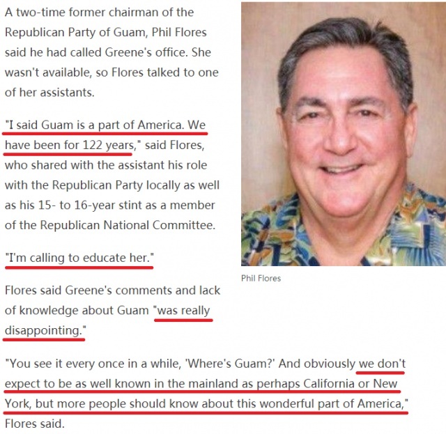 更令人难以忍受的是一些政客的无知妄言。不久前,美国佐治亚州共和党籍联邦众议员马乔里·泰勒·格林在一次公开演讲中,竟然错误地把关岛说成是一个不应该接受美国财政援助的“外国”。