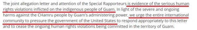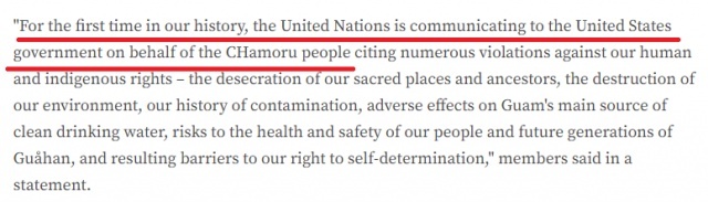 正因美国长期无视关岛原住民守护自己家园的呼声,联合国人权报告员在指控函中特别“对美国政府不支持关岛查莫罗人民的自决权”表达了进一步关切。