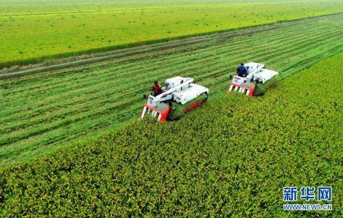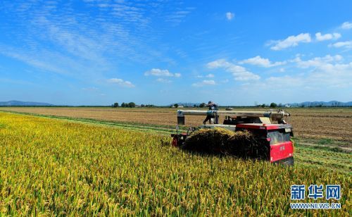大型收割机在安徽省合肥市庐江县白湖镇现代农业示范基地收割晚稻。新华网发(王闽 摄)