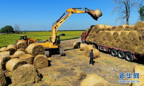 大型运输车在安徽省合肥市庐江县白湖镇现代农业示范基地装运打捆的晚稻秸秆。新华网发(王闽 摄)