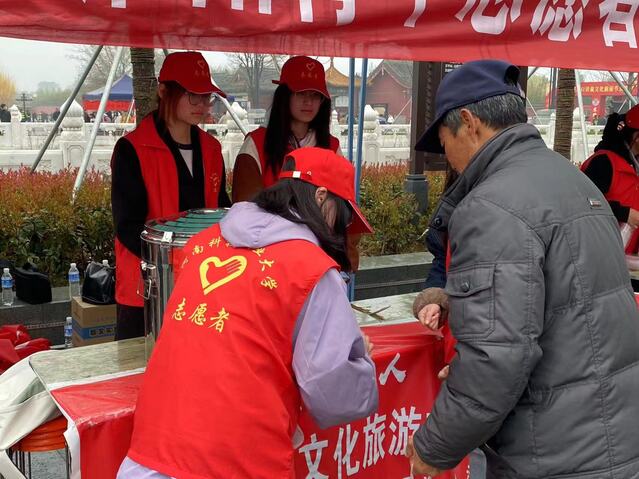 3月24日,河南科技职业大学青年志愿者在太昊陵景区开展志愿服务活动。活动现场,该校青年志愿者为游客提供免费热水、旅游咨询、乘车指引、便民服务等志愿服务。一个个温暖的举动彰显出当代青年的担当,也为庙会增添了一道文明风景线。②16