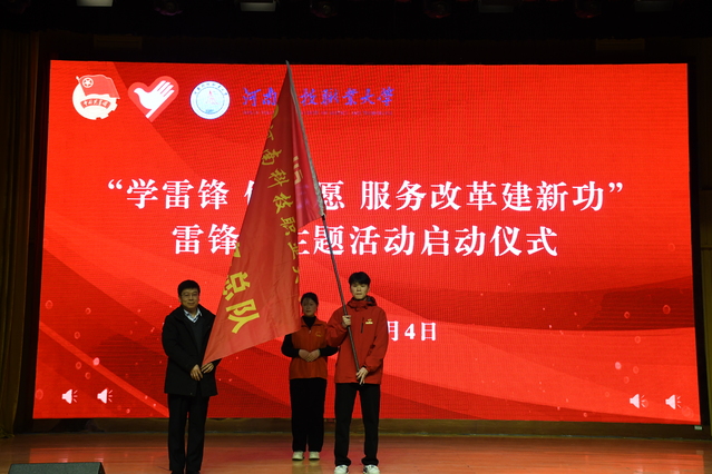 仪式现场举行了授旗仪式。该校领导为志愿者代表授旗,象征着雷锋精神薪火相传、生生不息。